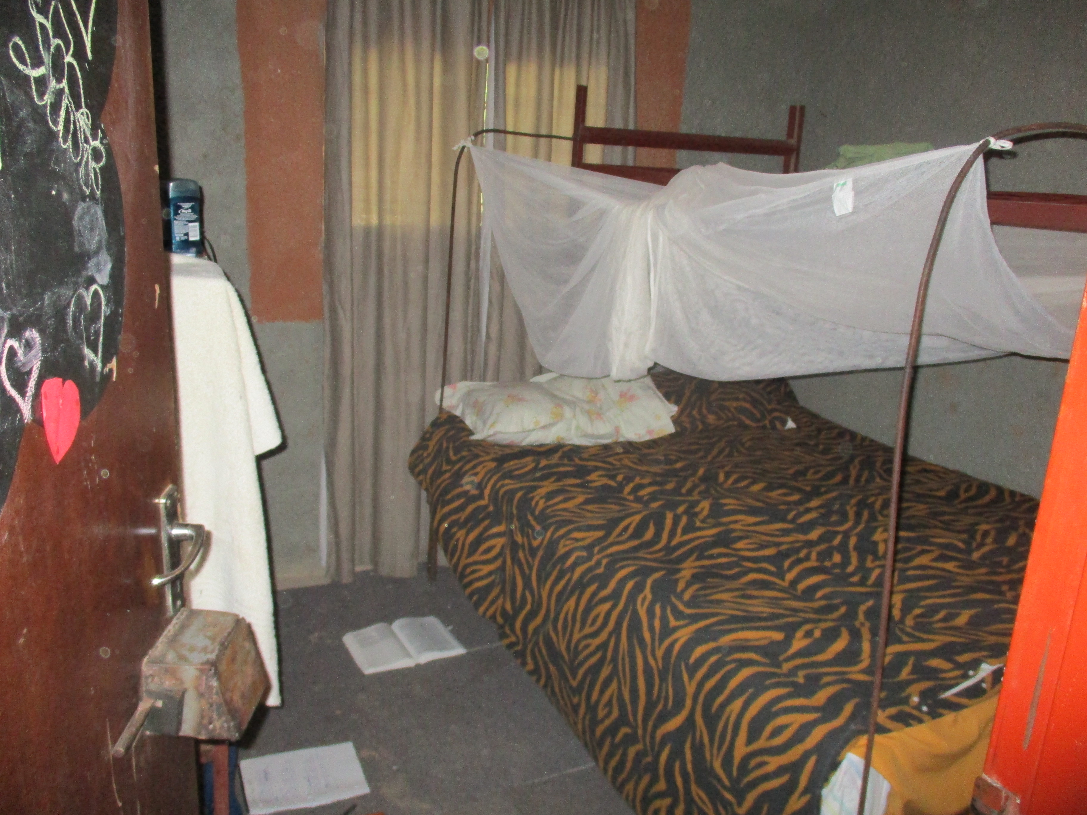 Several rooms were arranged around the periphery of this central room. The first to the left was Elisa and Delfina’s room. After that were two alcoves for showers, sinks, and toilets. At the back left was Wessel and Joan’s room; since the beginning they have lived in the same space as the Angolans to maintain the concept of familial connectedness. The kitchen was at the back, raised about a foot above the rest of the space. Continuing around the right side, next to the kitchen was a storage room, and next to that the business office. Next was my room, the door of which was decorated with my name and messages of welcome and love. Lastly, there was the room that Ericleidy and Herivaldo shared that also housed the control systems for the photovoltaic system. The municipal electric grid had not yet made it to the outskirts of Menongue, and a set of solar panels and batteries were the source of electricity.