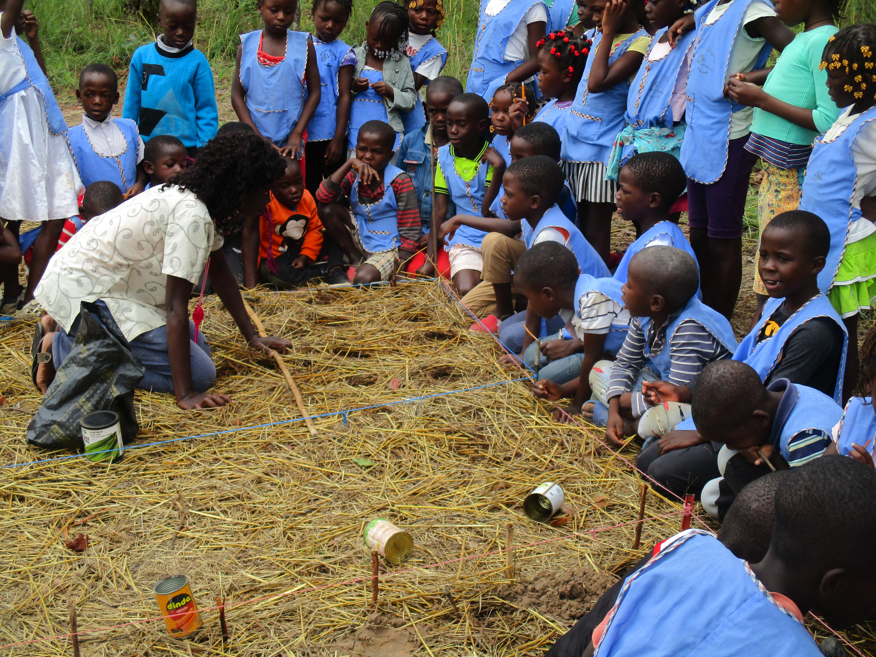 When I arrived, the children were learning how to plant seeds, which was the focus that year. Joan was also there, and she told me about their program. In the previous year the children had learned how to make compost and compost tea and how to properly feed and water the plants. They were growing kale inside the chicken-wire fence. There were lots of dragonflies and many frogs around, including a tiny species of frog that stays very small.