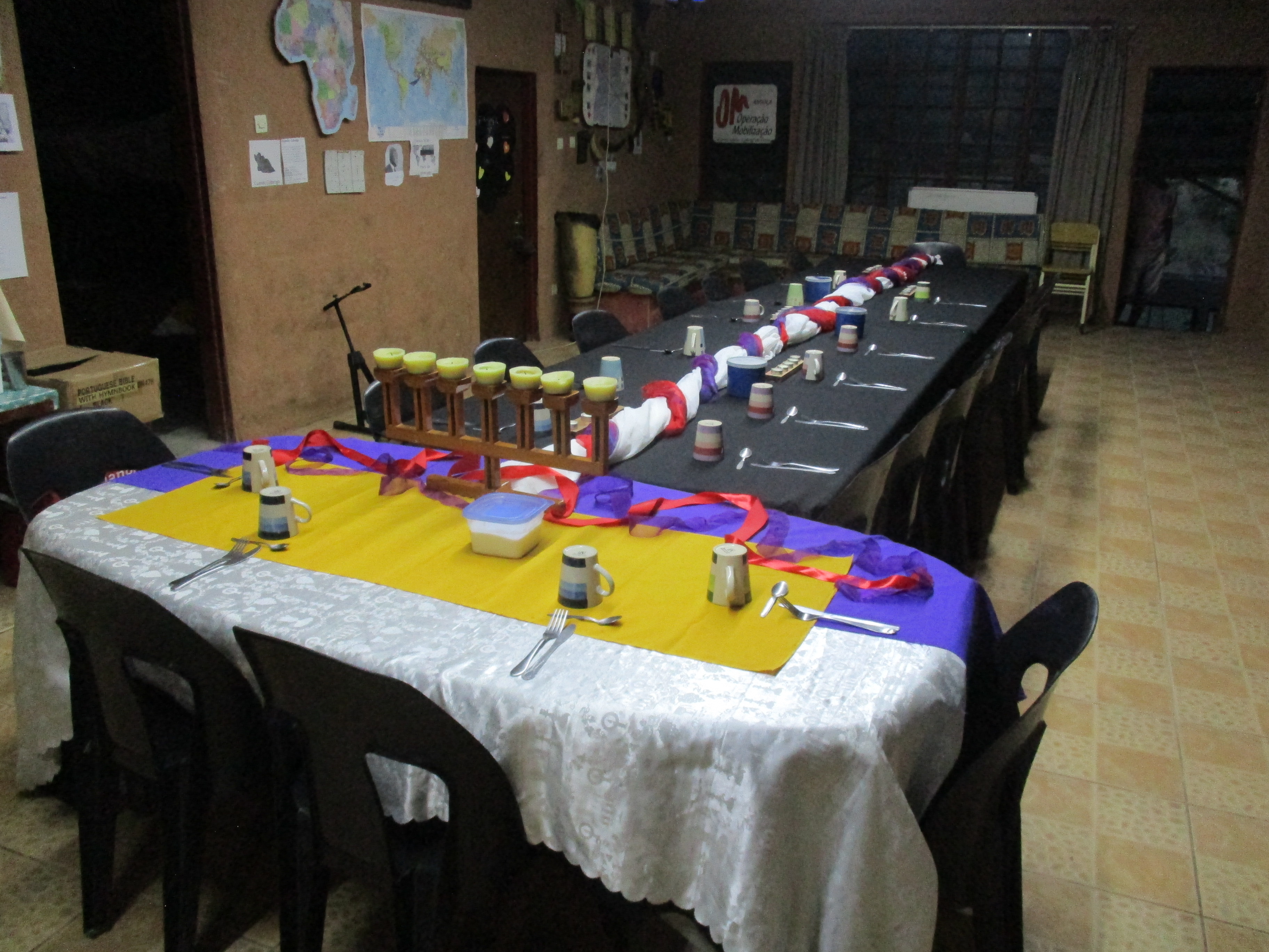 Friday night at the OM base is “Shabbat” night, a tradition borrowed from Judaism. It is the night before the Jewish Sabbath day, and the Judaic tradition is marked by blessings, prayers, and reflection. The OM group decorates the table in bright colors, and Wessel gives praise and blessings to his wife, the leadership, and the students. The meal that night was a watery flour grilled to a type of thick tortilla. There was a hint of fish or other meat broth mixed in for extra flavor. Games and other diversions are also a part of the Shabbat celebration in Menongue. This evening, they played a video of the previous year’s highlights, including their trip to the bushmen.