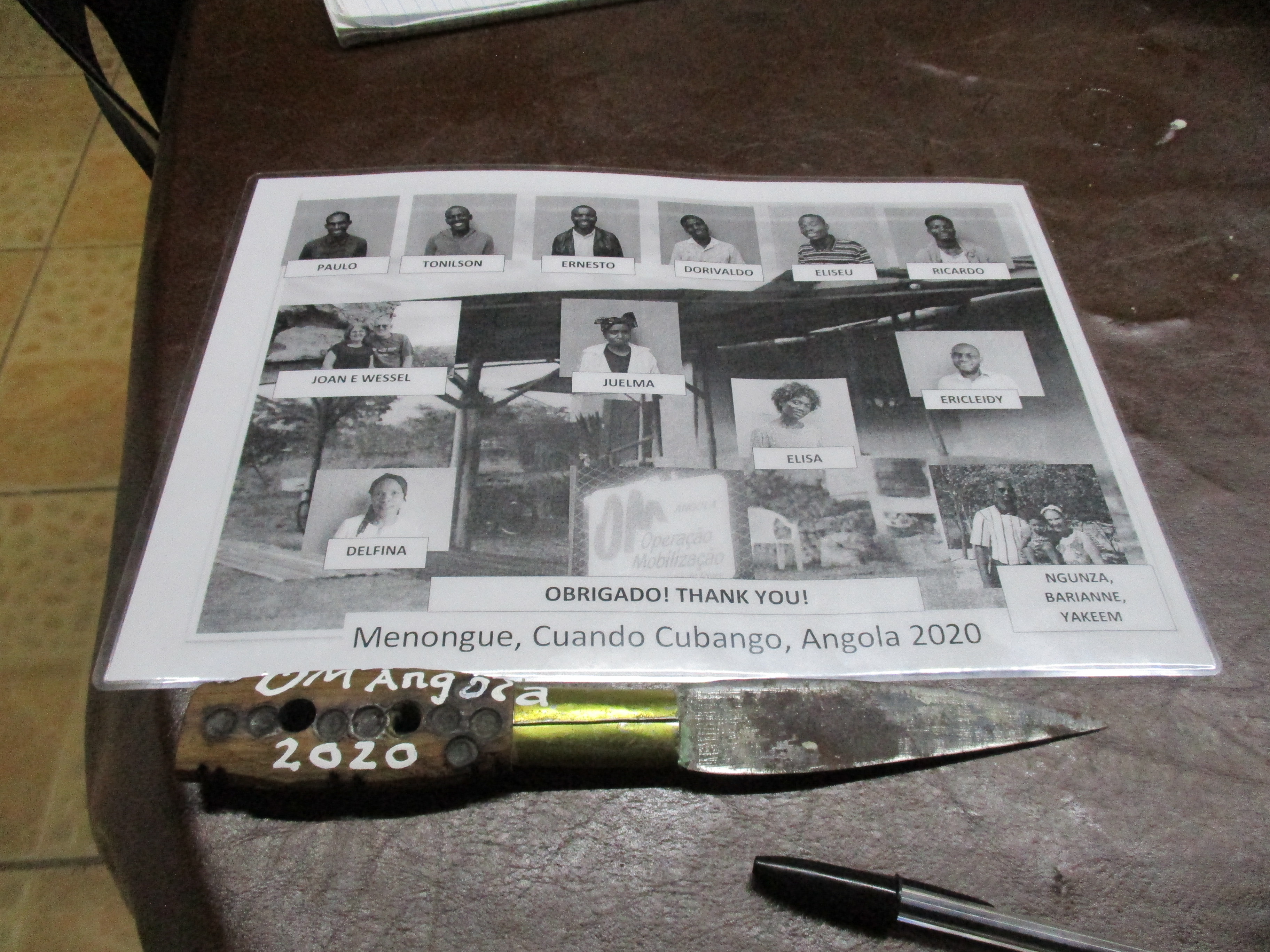 Everyone seemed to sense that my time with them was growing short. One evening, they presented me with two gifts to commemorate my time in Menongue. One was a laminated picture of the OM Menongue team and the seven mission students. The other was a hand-crafted Nganguela knife with the words “OM Angola 2020” painted on it.