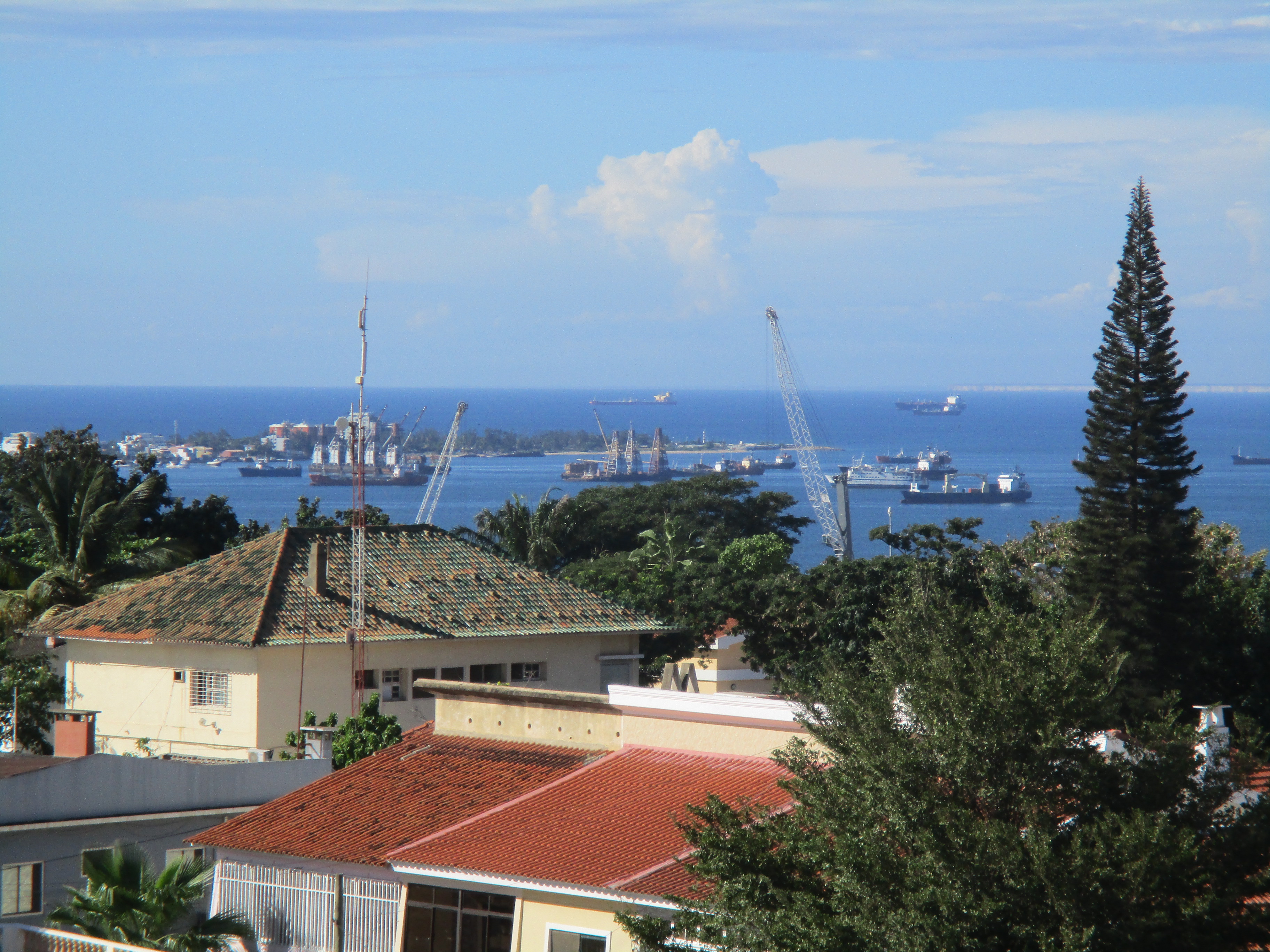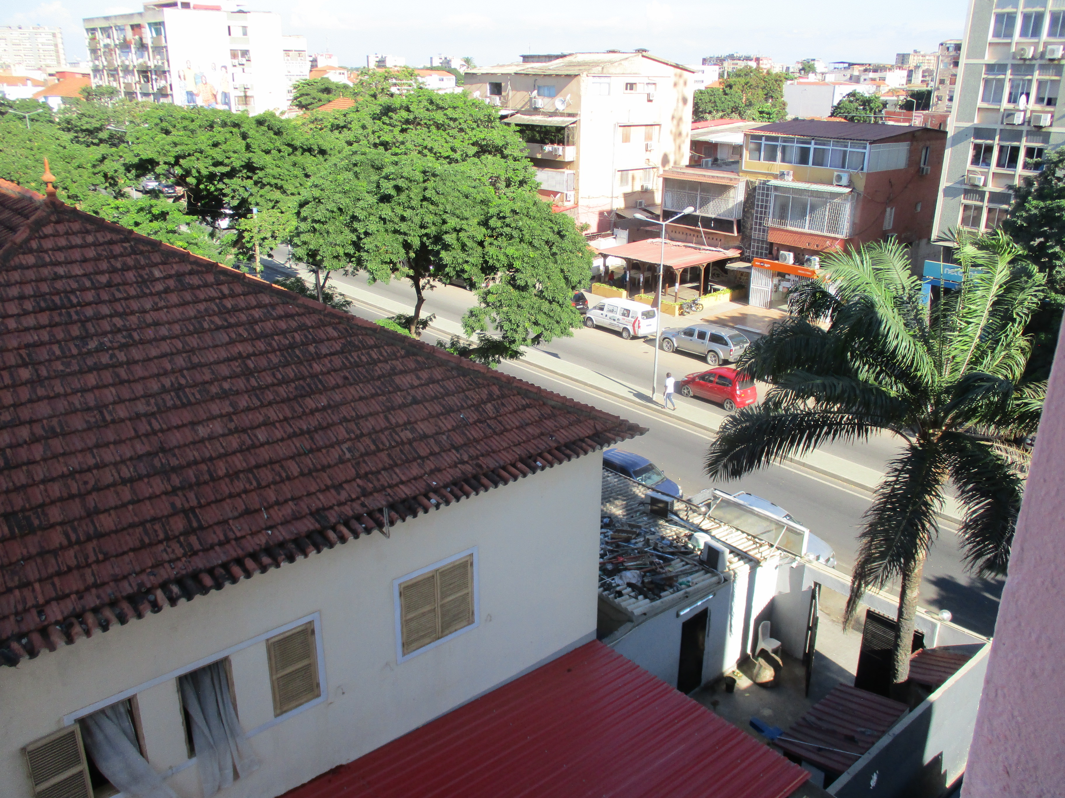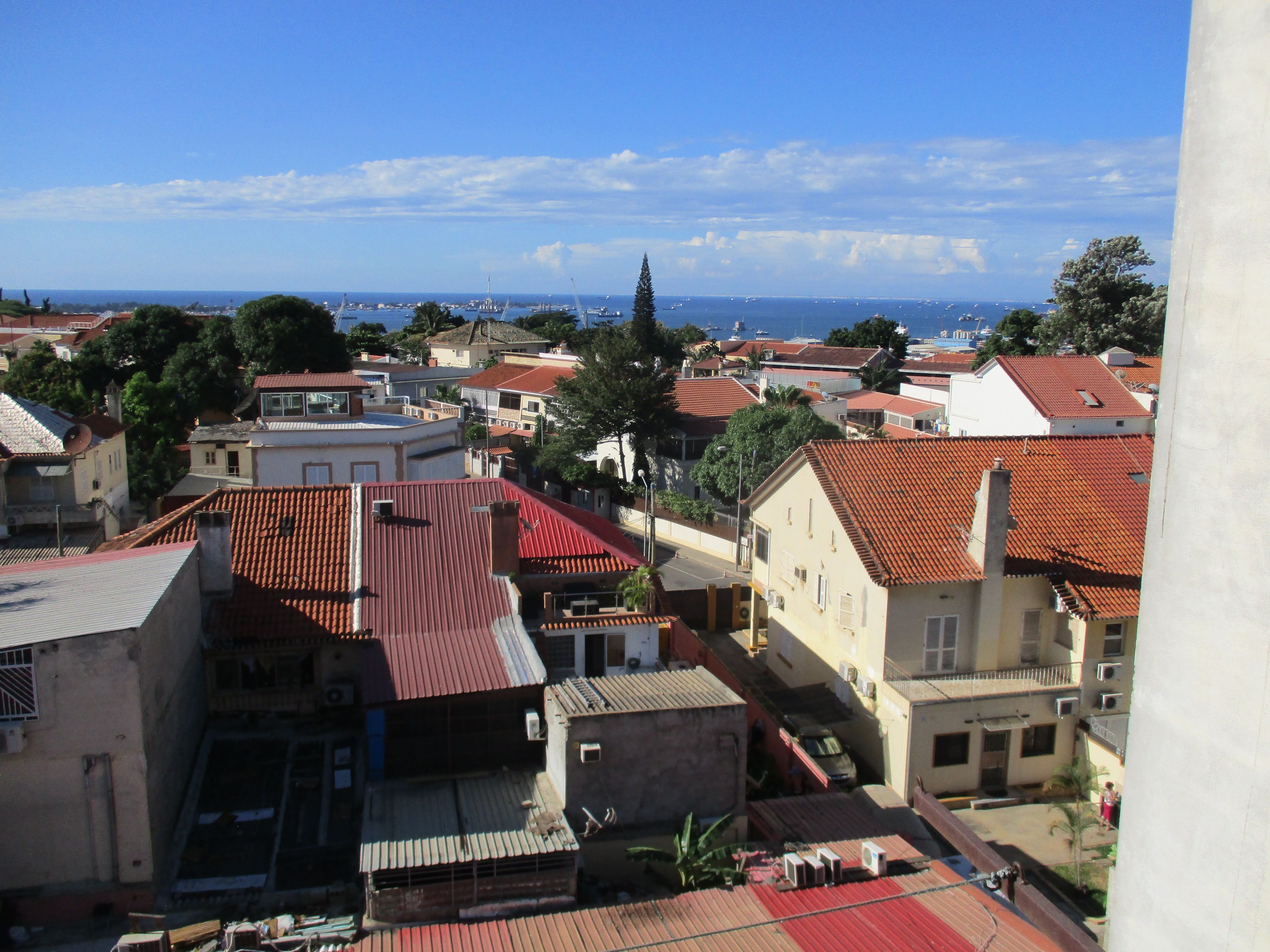 The building’s height afforded a commanding view of the city and the harbor, all the way to the Ilha do Cabo, a spit of land jutting into the harbor. The buildings around us were nice, and there were many fancy cars in the driveways. Most of the buildings were multiple stories tall, and many still had the red roof tiles from the Portuguese era, though some had been redone with corrugated metal sheets. Looking out from that balcony reminded me of the view out of the window of the church when I first came to Luanda weeks earlier, except that the buildings around that five story apartment were not covered in rubble to hold down the roofs.